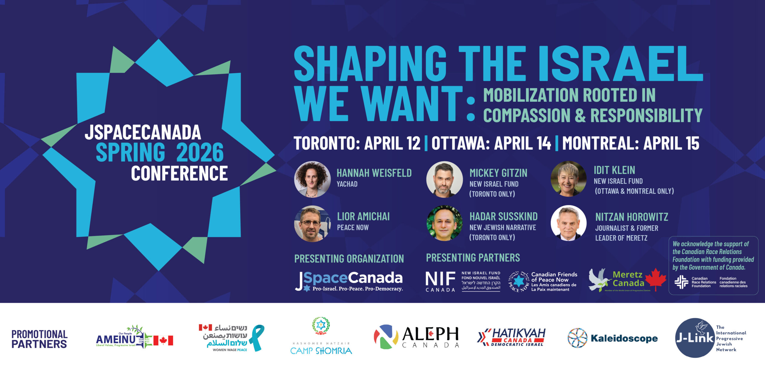 The annual JSpaceCanada Spring Conference, in partnership with the New Israel Fund of Canada, Canadian Friends of Peace Now, and Meretz Canada will take place in Toronto on April 12, 2026, with evening events in Ottawa on April 14 and Montreal on April 15.